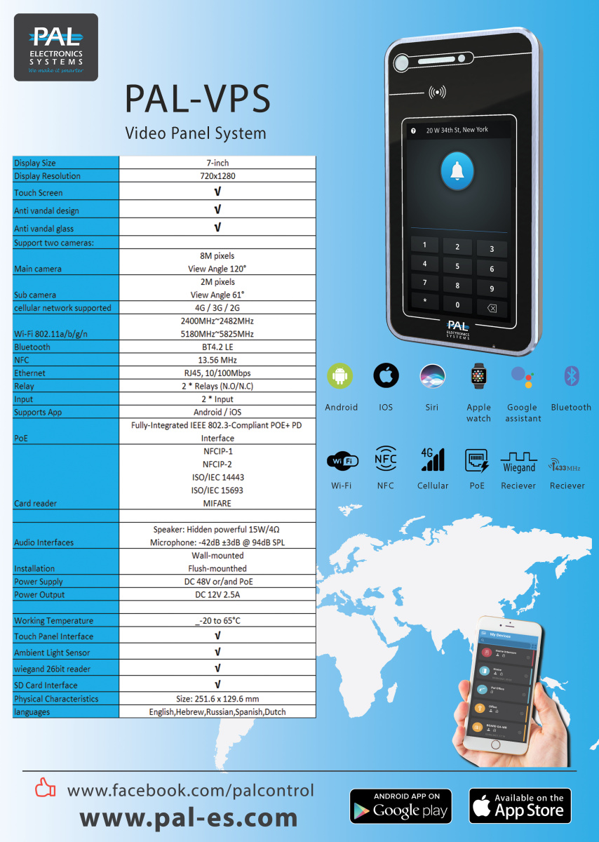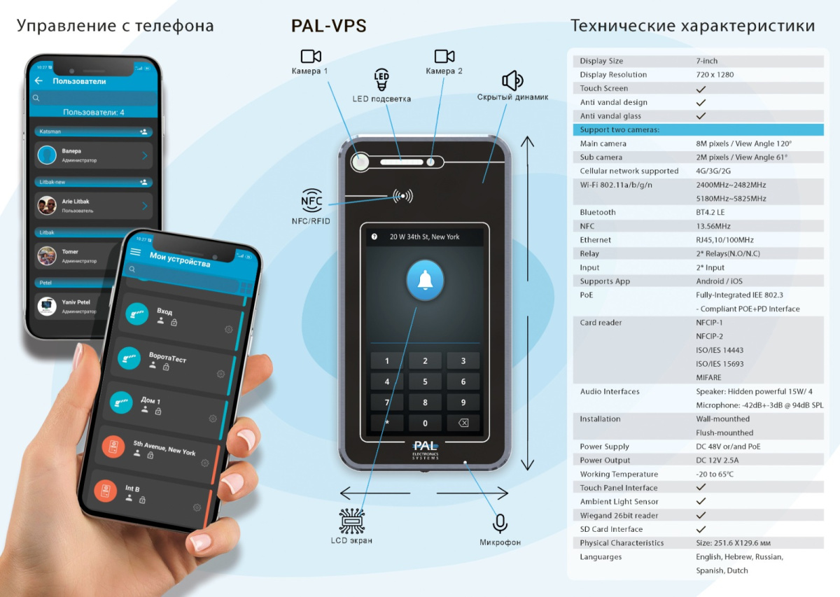 GSM, 2 Мп, Mifare, 120 гр., 5 квартир бесплатно, далее зависит от купленной лицензии, инфракрасная, накладной/врезной, два реле NO/NC, Wi-Fi/Bluetooth/NFC, DC 12 В/PoE